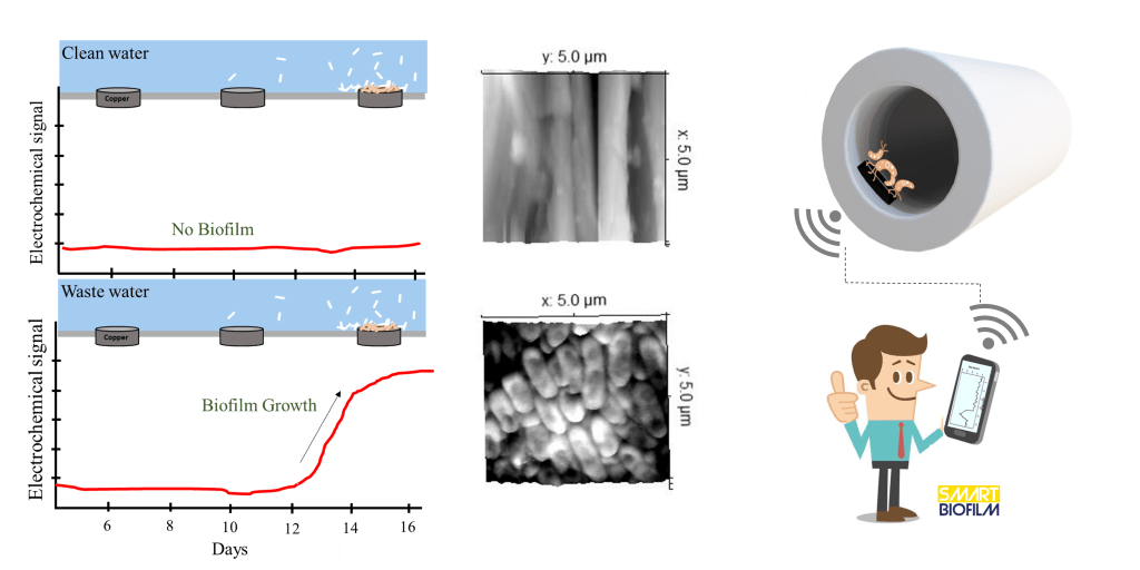Solution: Detection of biofilm is crucial to assess the purity of water and efficiency of disinfection treatments. This is achievable with the measurement of the electrochemical activity associated with biofilm growth. Real-time biofilm monitoring using a highly sensitive sensor can warn about bacterial settlement since its first phases. Based on the instant data provided, cleaning treatment can be adjusted and optimised manually or automatically